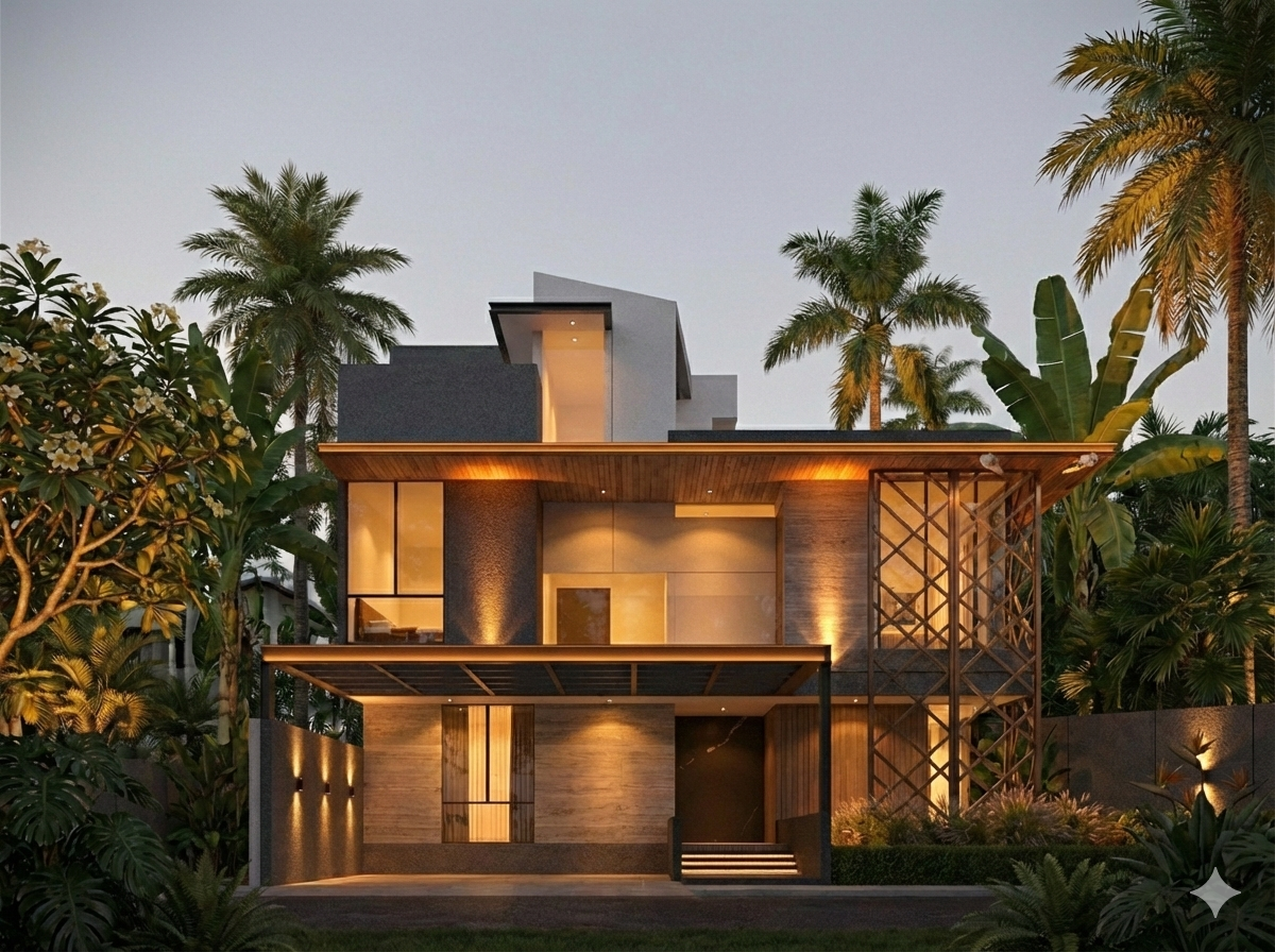 A contemporary urban residence defined by crisp volumes and restrained materiality, responding to its tropical context through proportion, shading, and openness.